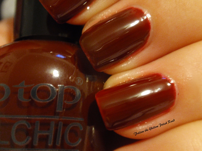 Chocolate Truffle is a deep red toned brown jelly. The application is smooth and glides on like a dream, opaque in two coats. I honestly thought this was a simple brown creme when I saw the bottle. I was blown away to see how amazing it looks on the nail. Its absolutely gorgeous! Smooth and glossy even before top coat.